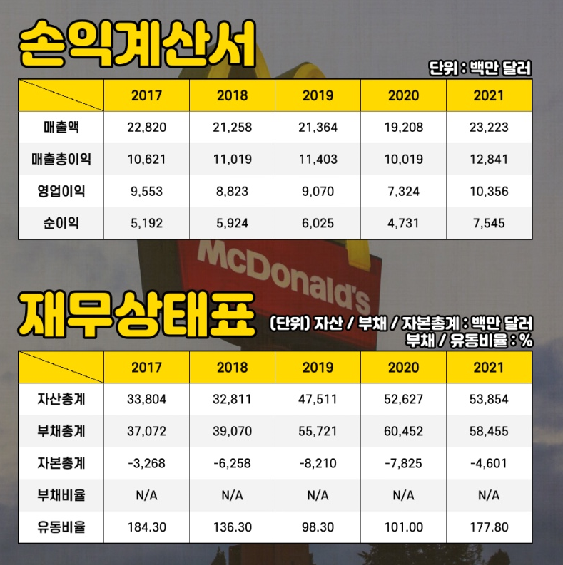 맥도날드의 시가총액을 보면 음수임을 알 수 있습니다.