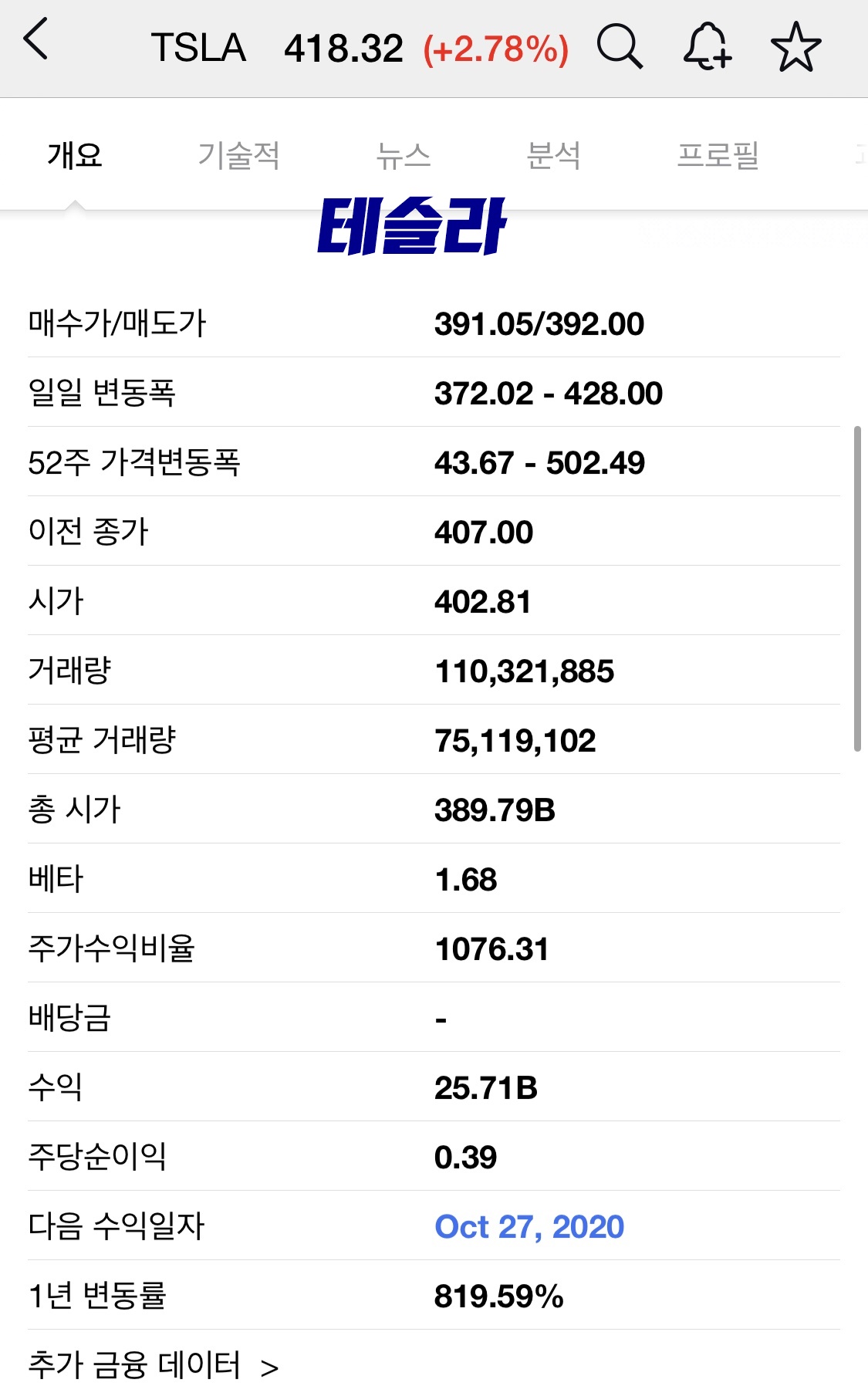 인베스팅 앱에서 테슬라를 검색해 가격을 확인하니 418달러로 나왔습니다.