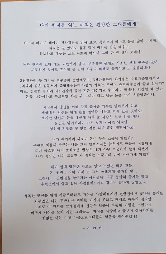 故이건희 회장의 마지막 편지로 알려지고 있는데, 어느 갑부의 편지가 잘못 알려진 거라고 합니다..