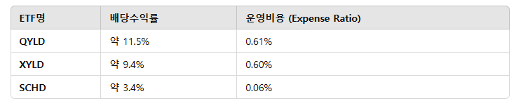 | QYLD | 나스닥 100 커버드 콜 전략 | Nasdaq-100 Index | 약 12~13% | 높은 배당, 장기적으로 주가 정체/하락 |