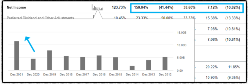 당기 순이익은 2021년에 150% 상승하여 순이익이 크게 성장했습니다.