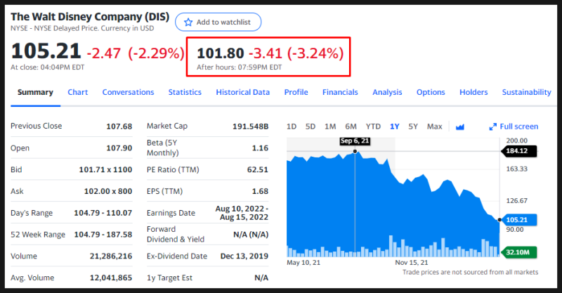 실적 발표 이후, 주가는 약간 하향하고 있습니다. 특히 최근 1년간 주가를 보니 작년 180달러 정도였던 주가가 현재는 100달러 초반까지 하락했습니다. 코로나의 끊임없는 변이 이슈로 인해 테마파크 개장 등의 어려움을 겪었기 때문입니다.