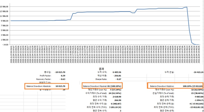 즉, 여기서 MDD는 81로 최고에서 최저까지 81이 떨어졌다는 뜻이고, Stopout 상태(투자원금이 모두 손실된 상태)이기 때문에 RDD는 100%입니다. (최고점에서 최저점으로 드랍률 100%)