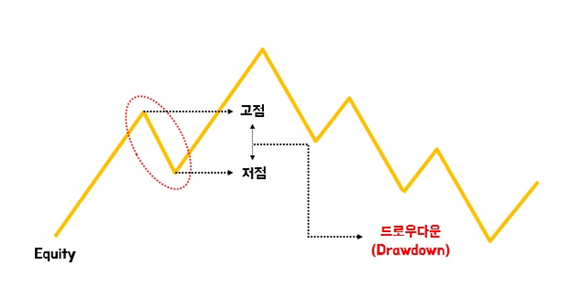 위의 차트에서 볼 수 있듯이 일정 수준까지 상승한 차트가 일부 악재를 접하고 하락하며, 그에 따라 발생하는 고점과 저점의 차이를 "드로우다운"이라고 합니다.
