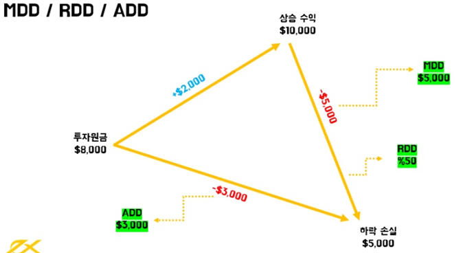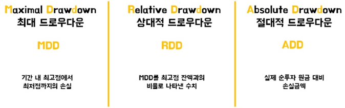 또한 RDD(Relative Drawdown)는 최고점의 잔액에 대한 MDD의 비율을 말하며, ADD는 원금 대비 손실액을 의미합니다.