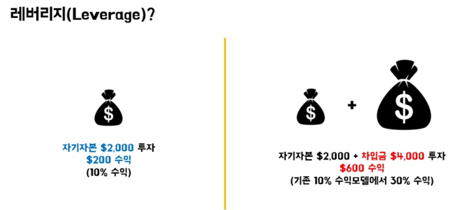 레버리지는 “자산을 투자하여 얻는 수익을 증대하기 위해서 차입자본(부채)을 끌어다가 자산매입에 나서는 투자 전략”을 뜻합니다.