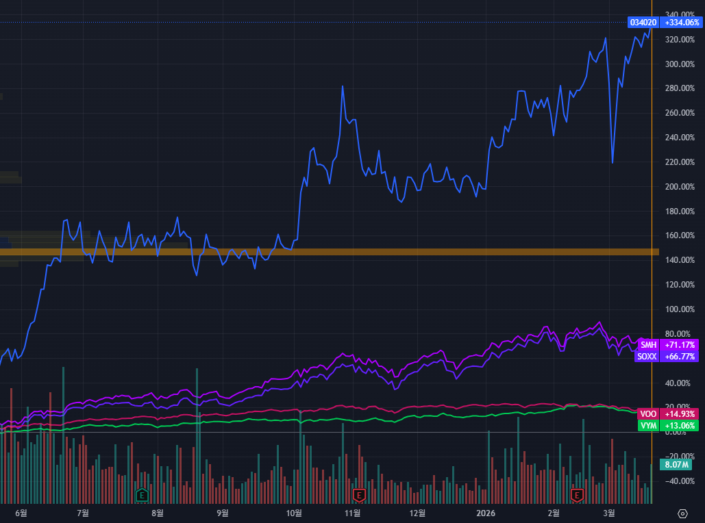 셋째, 트럼프 2기의 에너지 정책. 2026년 3월 대미투자특별법이 국회를 통과하면서, 3,500억 달러 중 약 2,000억 달러가 에너지와 반도체에 투입될 예정이다. 트럼프 행정부가 대형 원전 10기 착공 목표를 제시했고, 이 흐름에서 웨스팅하우스와 협업 가능한 제작사가 바로 두산에너빌리티다.