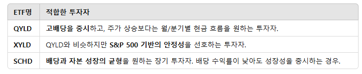 | QYLD | 나스닥 100 커버드 콜 전략 | Nasdaq-100 Index | 약 12~13% | 높은 배당, 장기적으로 주가 정체/하락 |