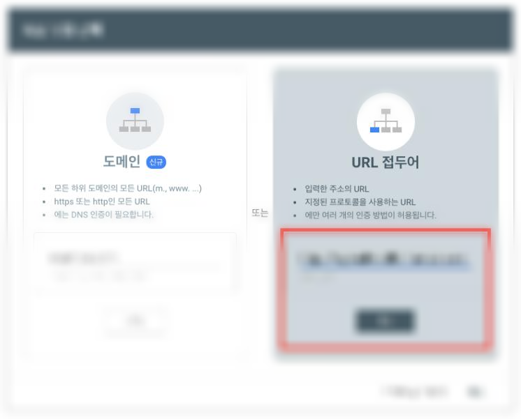 아래처럼 속성 유형 선택이 나타나면 URL 접두어 방식에서 검색 등록하는 URL 을 입력하고 계속을 클릭합니다.