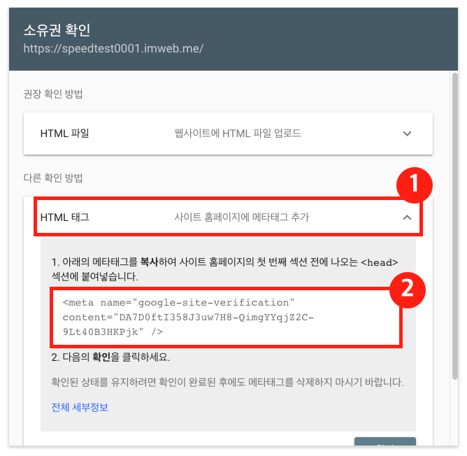 클릭하면 아래처럼 소유권 확인이 나오는데, 저는 HTML 태그 를 클릭하면 나오는 html 태그 붙여넣기를 추천합니다.
