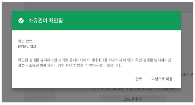 클릭하면 아래처럼 소유권 확인이 나오는데, 저는 HTML 태그 를 클릭하면 나오는 html 태그 붙여넣기를 추천합니다.