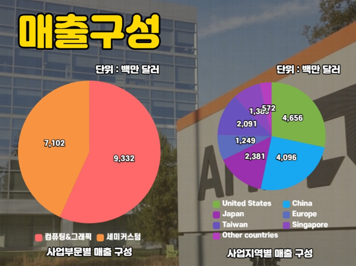 이 중 컴퓨팅과 그래픽이 매출의 가장 큰 비중을 차지해 약 56%를 차지했고, 세미 커스텀이 약 44%를 차지했습니다.