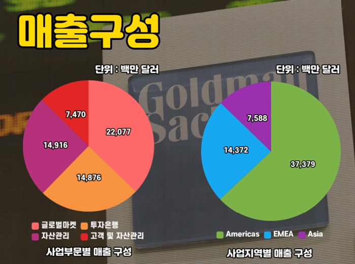 먼저 사업부문별 매출 구성을 보면 글로벌 마켓, 투자은행, 자산관리, 고객 및 자산관리의 4개 부문에서 매출이 발생하고 있음을 알 수 있습니다.