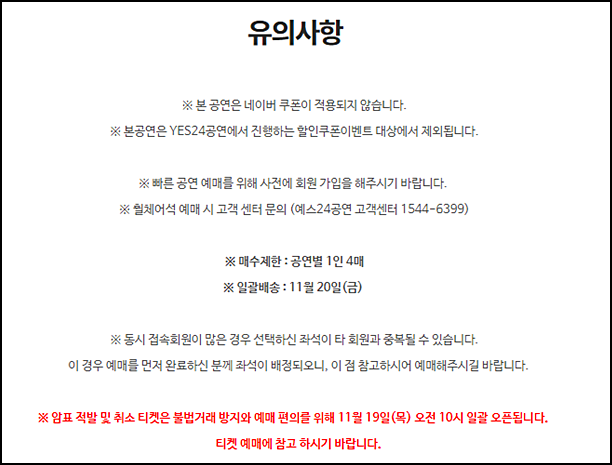 공연별로 1인 4장으로 제한되었고, 배송은 일괄배송으로 11월 20일 금요일부터 순차적으로 배송된다고 합니다.