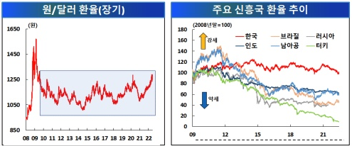 환율 변동은 주로 달러화 가치의 변동에 기인하며, 이 부분은 한국이 신흥국보다 안정적이라고 할 수 있습니다.