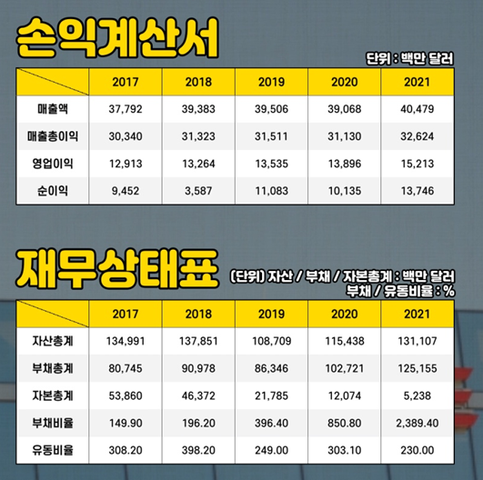 매출과 영업이익의 관점에서 보면 2020년 매출과 영업이익이 잠시 멈춘 것을 제외하고 2021년에는 꾸준한 성장세를 보였으며, 영업이익이 크게 증가했습니다.