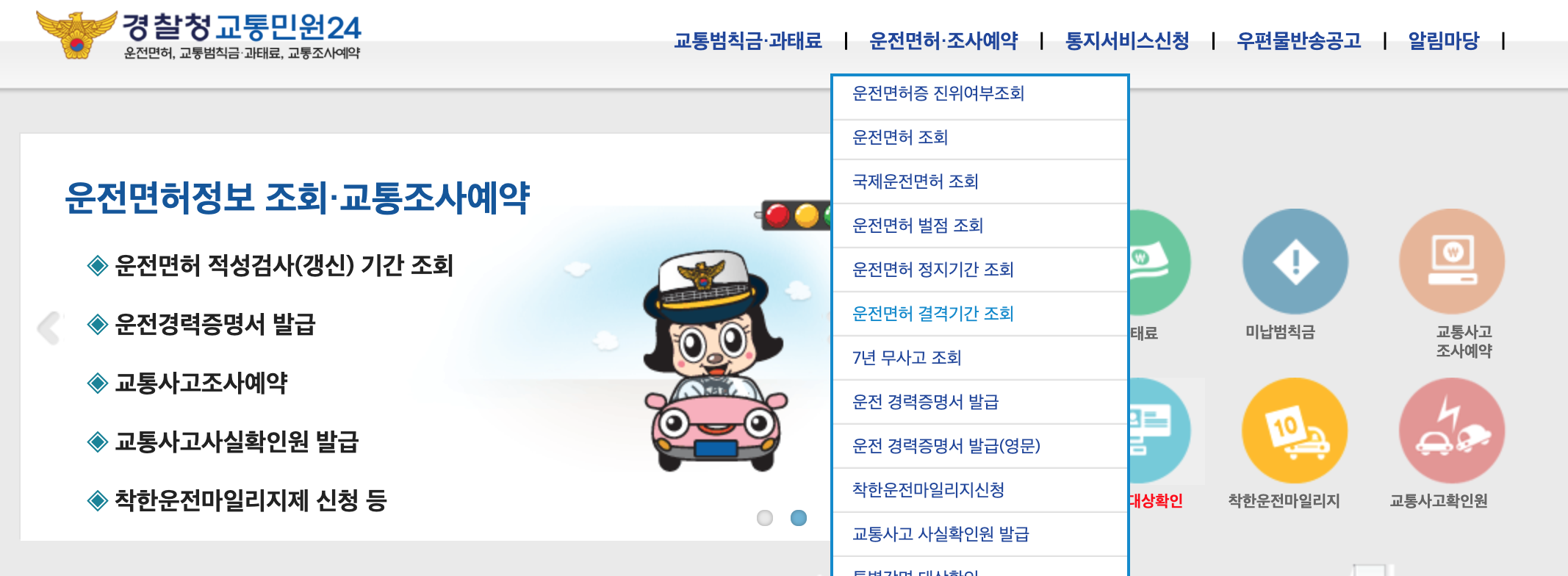 면허의 결격기간 및 정지기간은 교통민원24 홈페이지인 이파인에서 조회가 가능합니다.