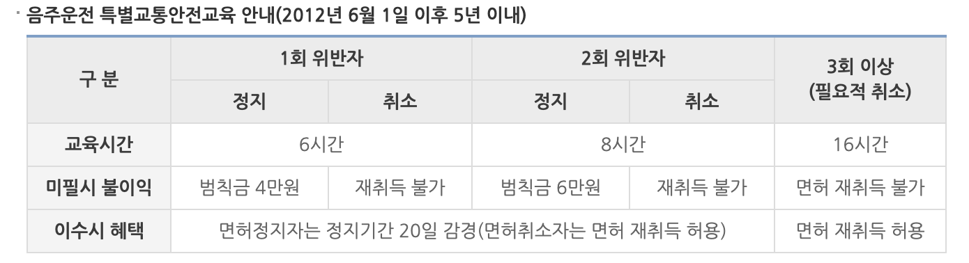 또, 현재 이진아웃제도 때문에 3회 이상부터는 교육을 16시간 들어야하지만, 면허 재취득은 불가한 점 참고하셔야 합니다.