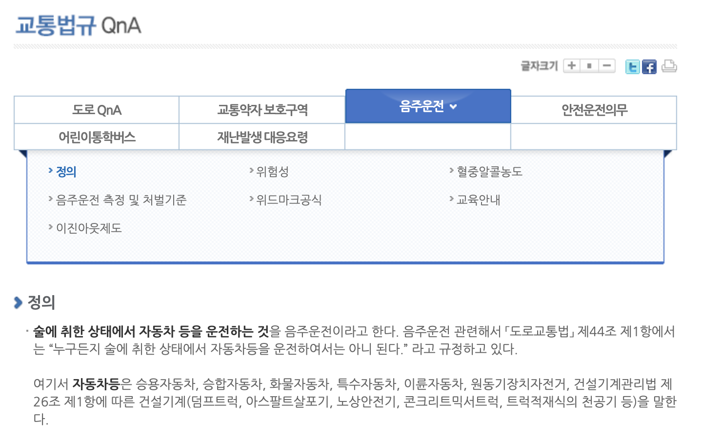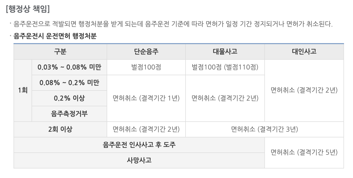 음주운전 메뉴를 눌러줍니다. 면허 재취득 자격이 몇년 전과는 달라졌음을 알 수 있습니다.
