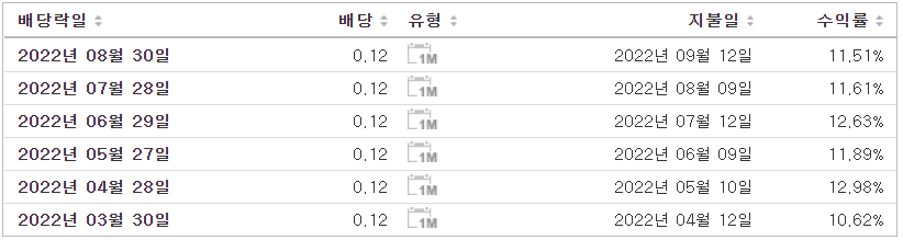 배당 내역을 보면 배당수익률이 꾸준히 상승하고 있는 것을 알 수 있습니다.