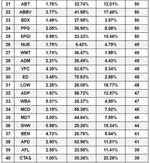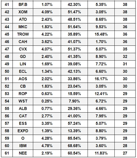 마이크로소프트 / 비자 / 존슨 앤 존슨 / 맥도널드 / 보잉 / 뱅크 오브 아메리카 / 펩시코 / 월마트 / 인텔 / 웰스파고 / 허니웰 인터내셔널 / 도미노피자 / 퀄컴 / 블랙록 / 길리어드 사이언스 / 3M / 유나이티드헬스 그룹 / 암젠 / 홈디포 / 아날로그디바이스 / 로스스토어 / 스카이웍스 솔루션스 / 켈로그 / 에스티로더 / 골드만삭스 / 브로드컴