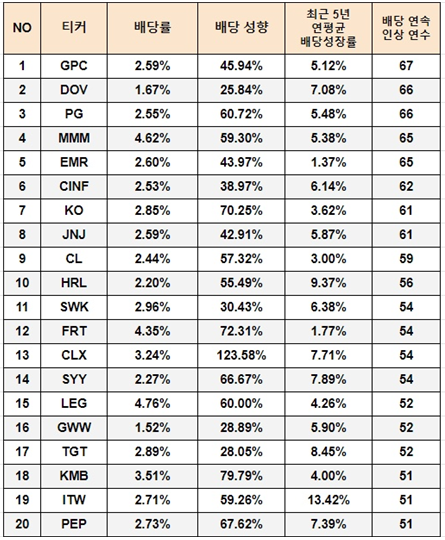 이제 배당귀족의 배당주 상위 20개 종목과 배당성장주 상위 20개 종목을 살펴보겠습니다.