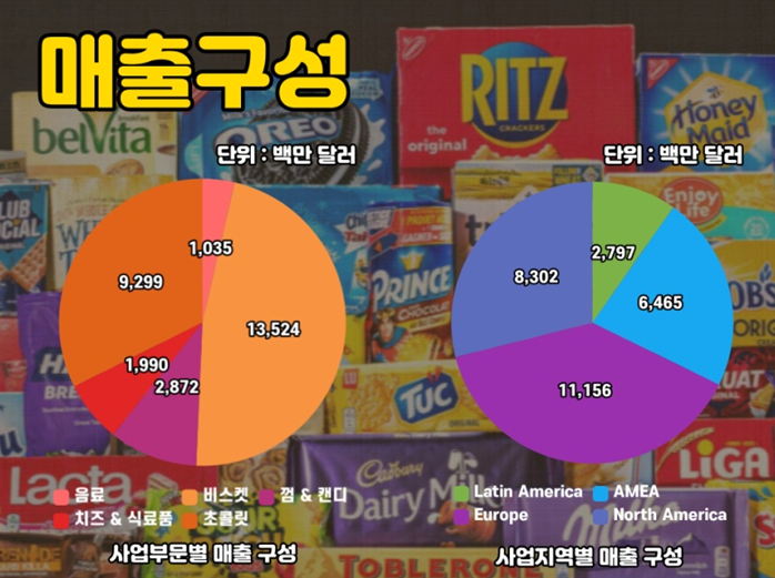 비스킷 매출이 전체 매출의 약 47%로 가장 큰 비중을 차지했고 초콜릿, 츄잉껌과 캔디, 치즈와 식료품, 음료가 그 뒤를 이었습니다.