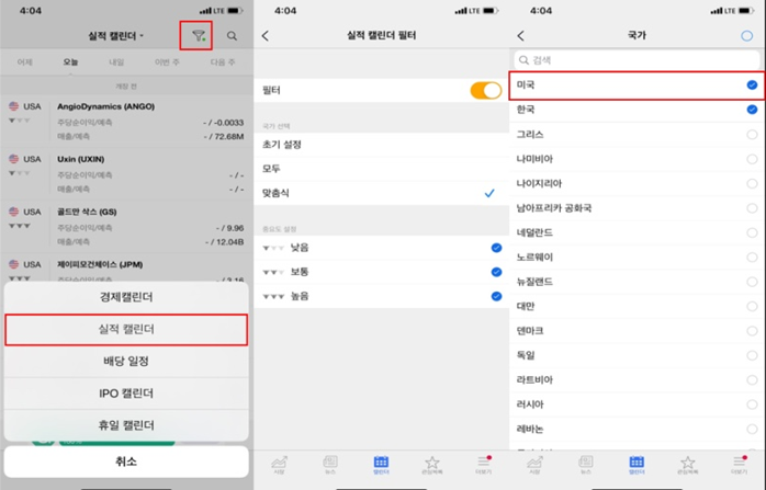 앱 다운로드 후 메인 화면을 보면 달력이 여러 개 있는데, 실적 캘린더에서 미국 국가를 선택하면 미국 기업의 실적을 볼 수 있습니다.