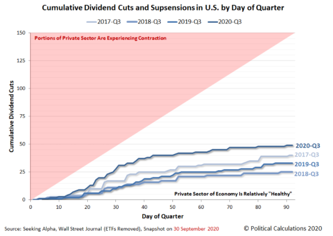 2020-Q3는 차트에 표시된 다른 역사적 분기보다 배당금이 더 많이 삭감되었지만 주로 상반기에 나타났습니다.