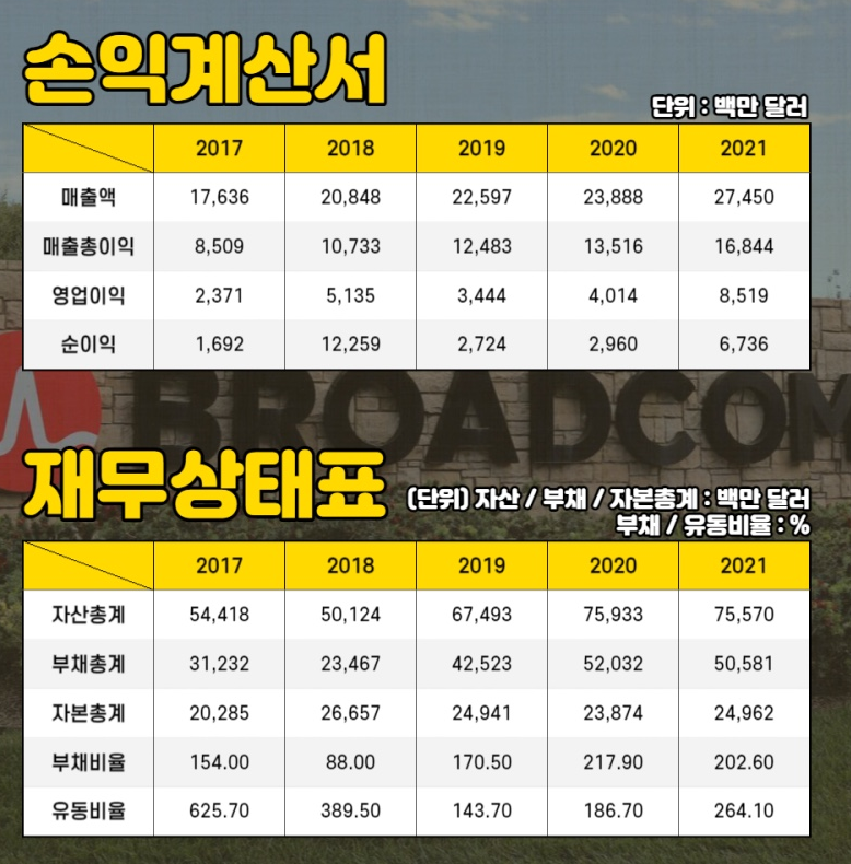오늘 소개할 미국 회사는 미국 내 3대 반도체 회사 중 하나인 브로드컴으로, 반도체 및 통신용 인프라 소프트웨어 설루션을 설계하는 회사입니다.