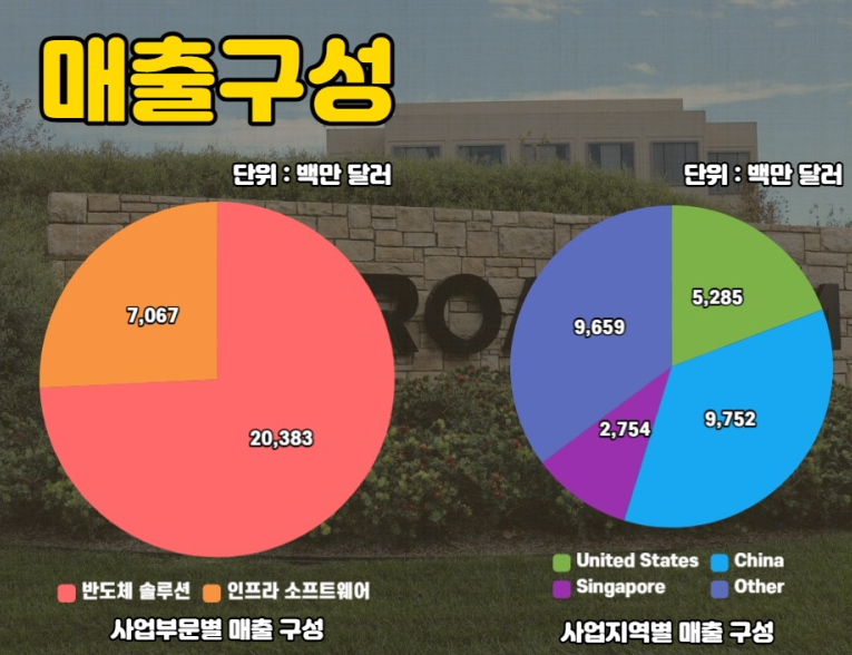 브로드컴의 사업 부문별 매출 구조를 보면 반도체 설루션과 인프라 소프트웨어 부문에서 매출이 발생하고 있음을 알 수 있습니다.