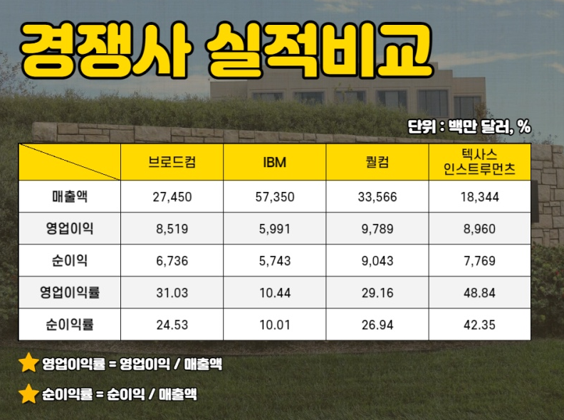 브로드컴의 경쟁업체에는 IBM, 퀄컴 및 Texas Instruments가 있습니다.