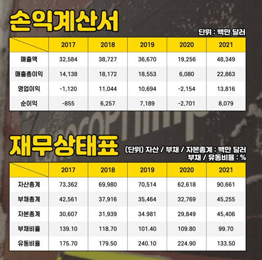 매출 및 영업이익 면에서는 2017년 영업적자가 있었지만 이듬해 크게 반등했고 2020년 다시 적자 전환했으나 2021년에는 최근 5년 중 매출과 영업이익 최고치를 달성했습니다.