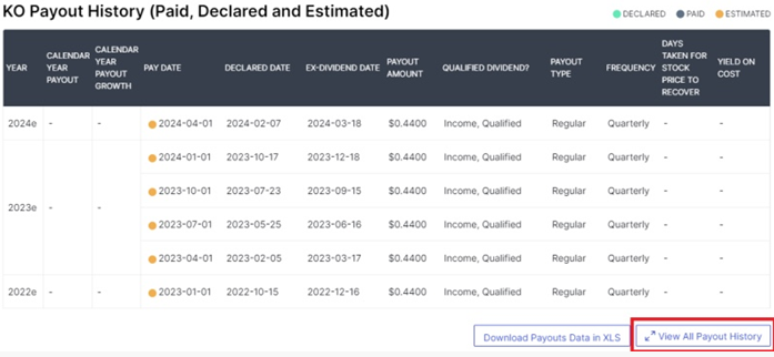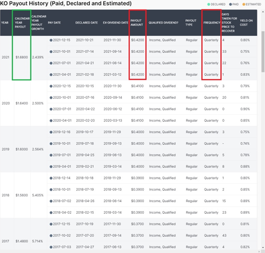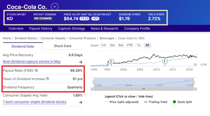 위의 지표를 보면 코카콜라가 61년 동안 배당금을 늘려왔다는 것을 알 수 있습니다.