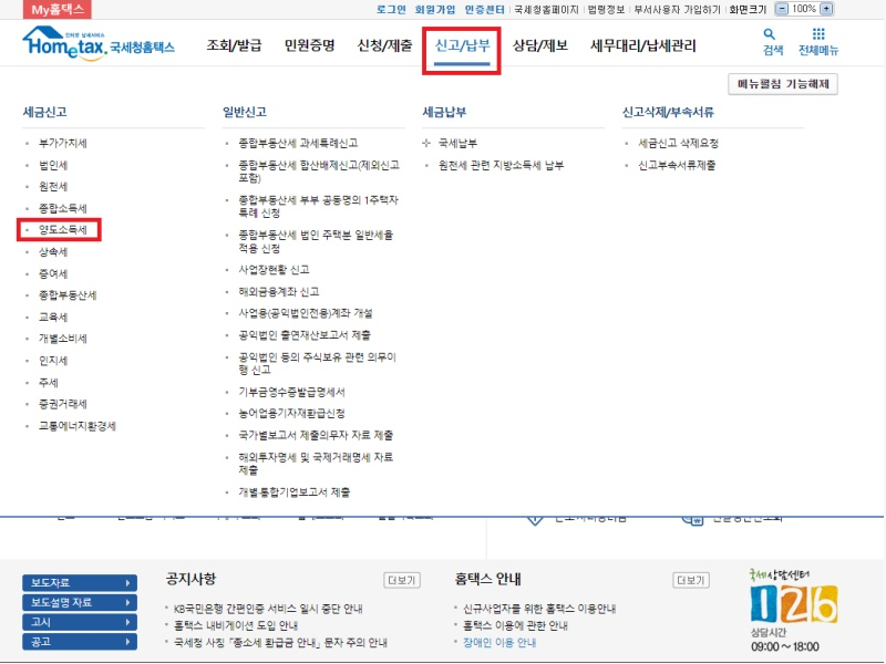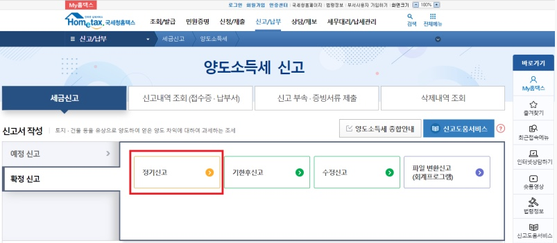 홈택스를 통해 직접 세금 신고서를 제출하려면 먼저 홈택스 웹사이트로 이동하여 공인 인증서로 로그인하고, 상단 메뉴 "신고/납부에서 양도소득세를 클릭하여 다음 페이지로 이동합니다.