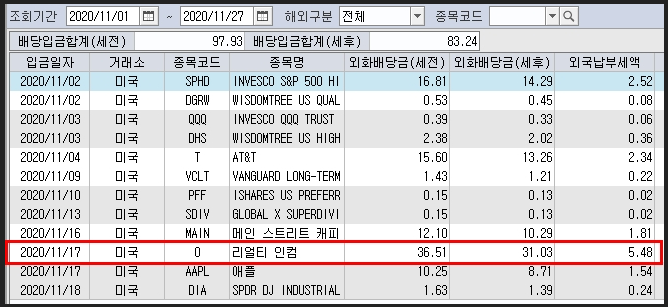 미국주식 배당으로 11월달에 리얼리티인컴 (티커 : O) 는 약 31.3$ 을 받았네요 :)