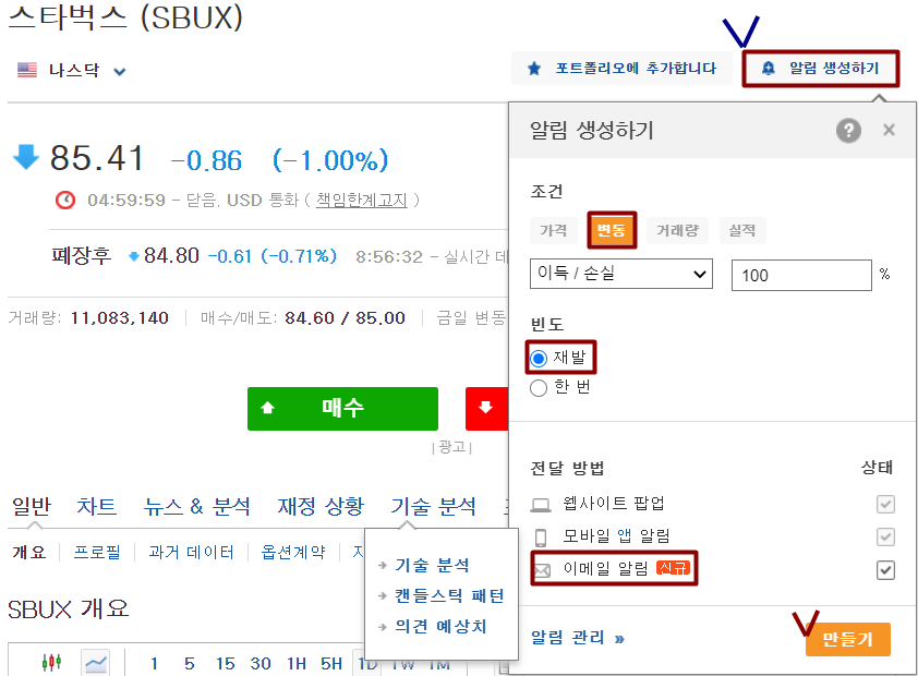 저는 수익률을 기준으로 알림을 생성했습니다. 조건을 변동으로 설정 후 수익률에 따라 알림을 받을 수 있습니다
