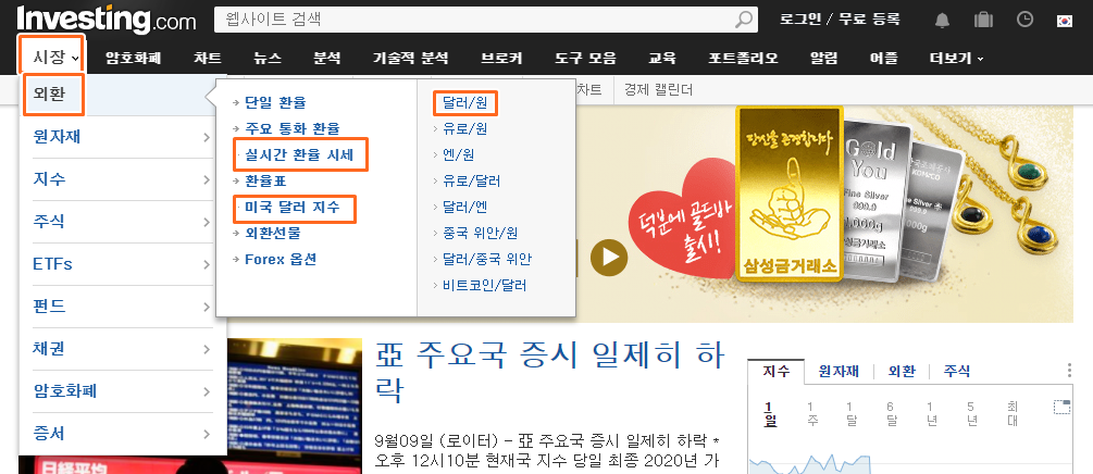 세계 주요 지수를 확인하고 , 미국 달러 지수를 확인합니다.