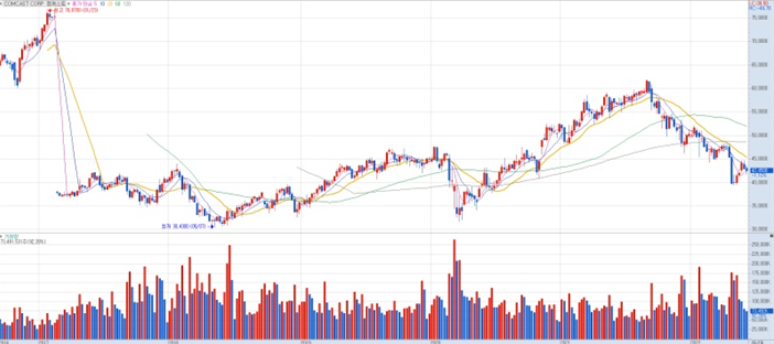이는 5G 통신 사업 확대와 인터넷 보급량 증가로 유선 케이블을 통한 인터넷 접속 수요가 줄어듬에 따라 케이블 통신 매출의 비중이 큰 컴캐스트 매출이 줄어들 것이라는 우려 때문으로 풀이됩니다.