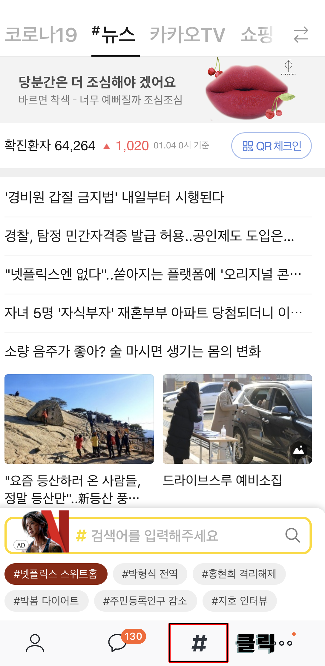 1) 미스트롯2 공식투표 모바일 앱 '카카오톡' 접속 후 , 하단 샵(#) 버튼 눌러 상단 TV메뉴 클릭