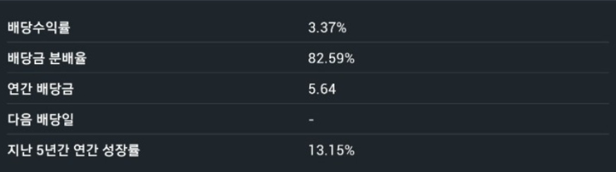 지난 5년간의 배당 성장은 평균 13.15%로 아주 높은 편입니다.