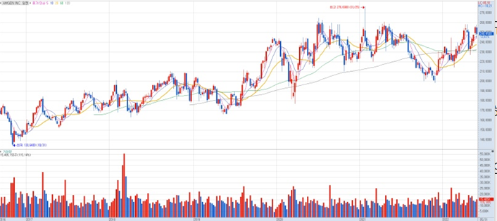 2021년까지 암젠의 5년 매출 및 주가 동향을 살펴보겠습니다.