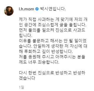 "이유를 불문하고 당사는 소속 아티스트에게 이와 같은 사건이 발생하게 된 점에 대해 깊이 책임을 통감하고 있으며, 박시연 역시 깊이 뉘우치고 반성하고 있다" 며 "다시 한번 물의를 일으킨 점 진심으로 사과드립니다"라고 덧붙였습니다.