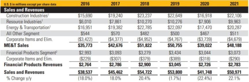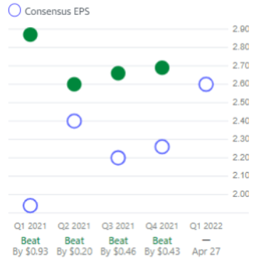 캐터필러의 주당순이익은 2021년 1분기부터 시장의 예측치를 지속적으로 상회하고 있습니다.