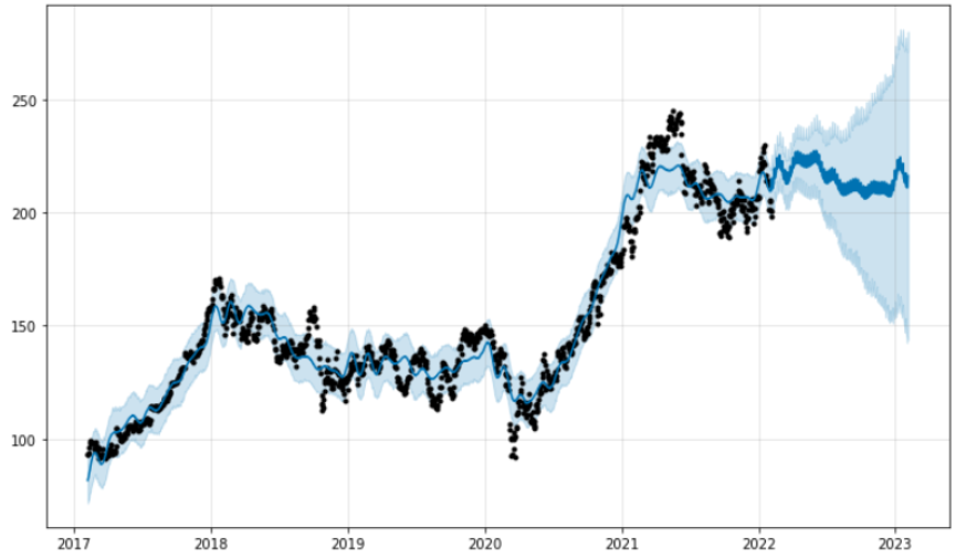 시계열 분석을 진행하여 지난 5년의 주가 데이터, Meta Prophet 알고리즘, 파이썬 코딩을 활용한 그래프입니다.