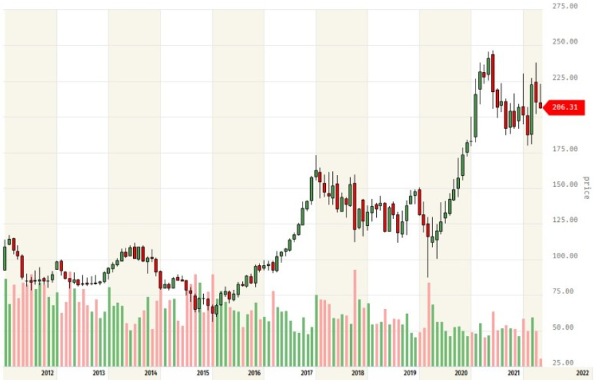 캐터필러의 주가는 지난 5년간 약 106% 상승했습니다.