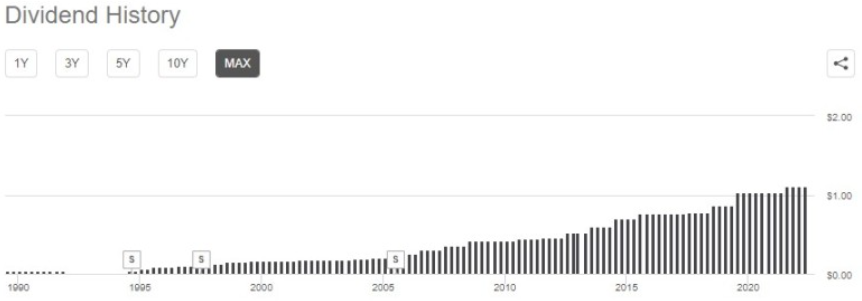 최근 배당금 인상은 2021년 8월 $1.03에서 $1.11로 7.8% 인상되었습니다.