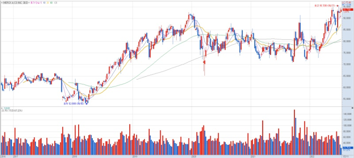 “베렌버그는 제약부문에서 저위험 가치주로 머크(MRK)를 꼽고 보류에서 ‘매수’로 투자 의견을 상향했다. 목표 주가로는 100달러를 제시했다. 이는 현재가보다 17% 올라갈 여력이 있다.