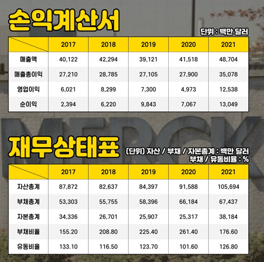 다음으로 2017년부터 2021년까지 5년간 머크의 실적과 주가 변화를 살펴보겠습니다.