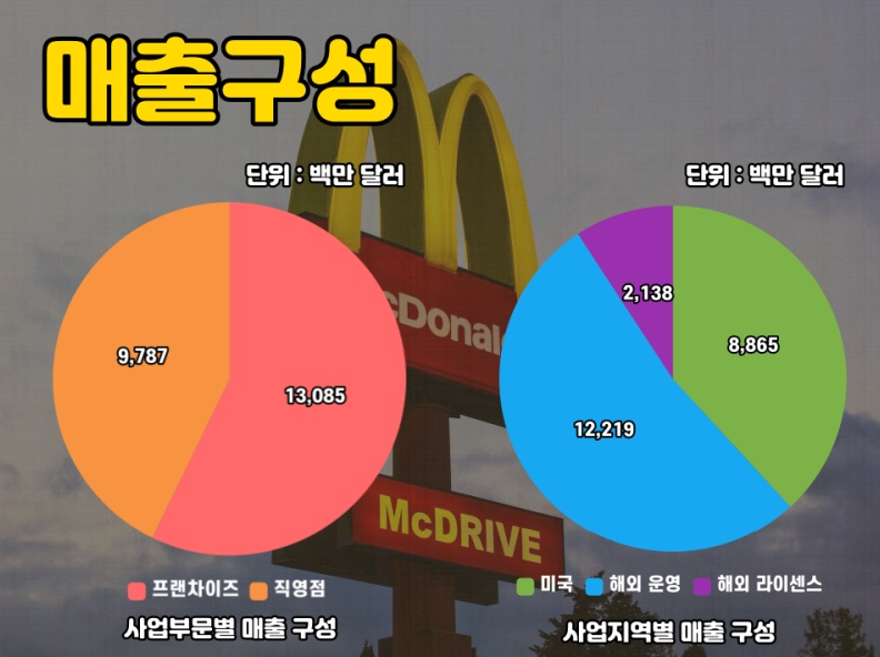 먼저 맥도날드의 사업 부문별 매출을 보면 매출이 프랜차이즈와 직영의 두 가지 범주로 나뉜다는 것을 알 수 있습니다.
